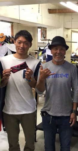 ウエット生地をカットするのもコツがあるんですよ。以前の写真ですが保坂君も体験しました。