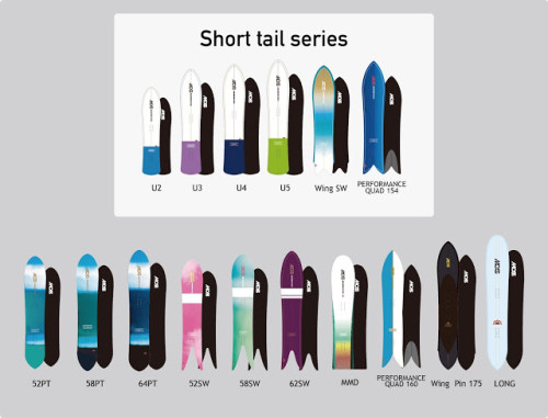 上のUシリーズ、WING SW、PQはテールが短く、サーフボードのショートボードに似たスタンス、スタイルで乗る板というわけです。