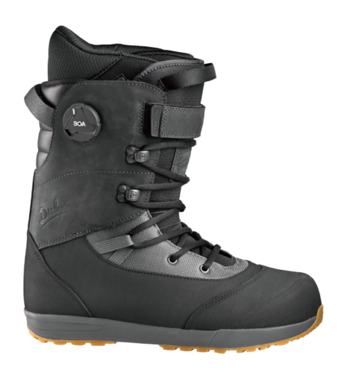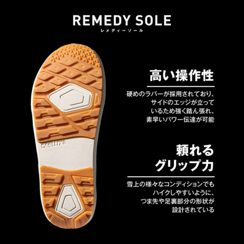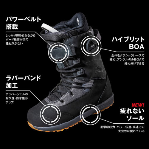 パウダーで気持ちよくターンする為に開発され、アウターには本革とラバーバンドを採用し、ゲレンデだけでなくハイクアップも想定した耐久性と防水性を持ち合わせ、