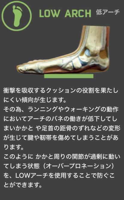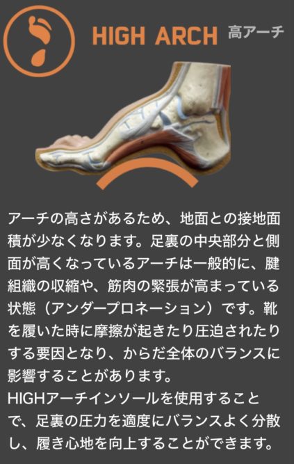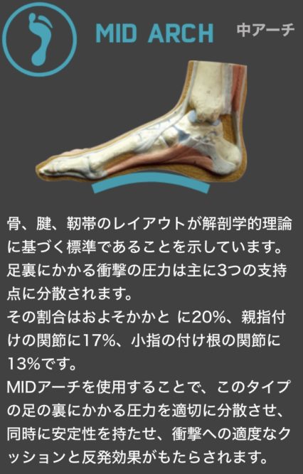 タイプはHIGH(高アーチ)・MID(中アーチ)・LOW(低アーチ)の3タイプに分かれます。