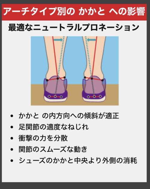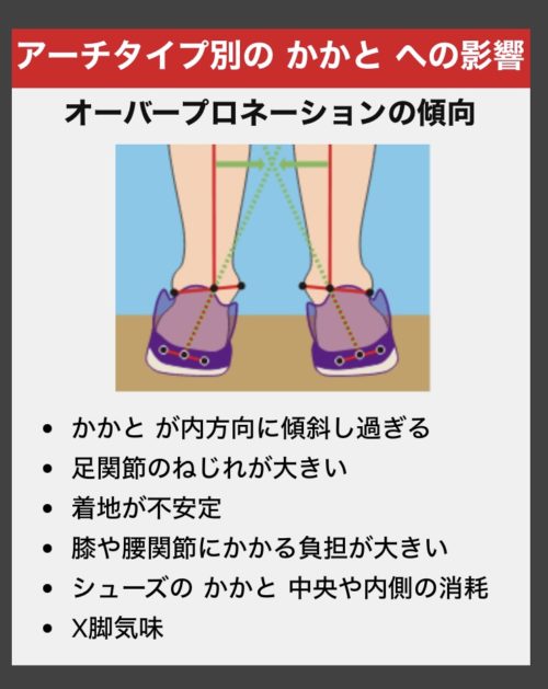 土踏まずのアーチタイプにより、内方向に傾斜し過ぎるオーバープロネーションや、傾斜が不十分なアンダープロネーションとなります。
